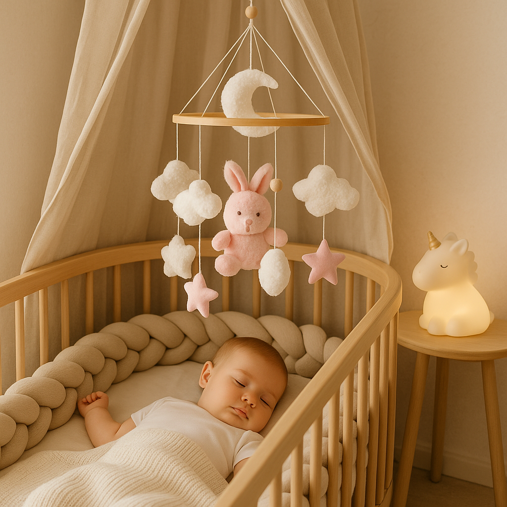 Chez Mes Essentiels Bébé, nous créons un univers rassurant, poétique et harmonieux — des veilleuses qui réconfortent, des mobiles qui éveillent en douceur, et des touches de décoration qui transforment chaque moment en parenthèse de tendresse.